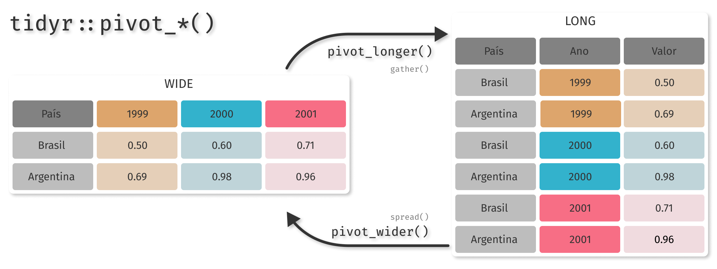 read_csv(): serve para ler arquivos com , como separador de colunas e . como decimalread_csv2(): arquivos com ; como separador e , como decimalread_delim(): TAB, ou outros como separador de colunas?read_*() no console e leia a documentação desta família de funções.tidyr::O tidyr é um pacote que serve para organizar as tabelas em um formato específico: o formato tidy.