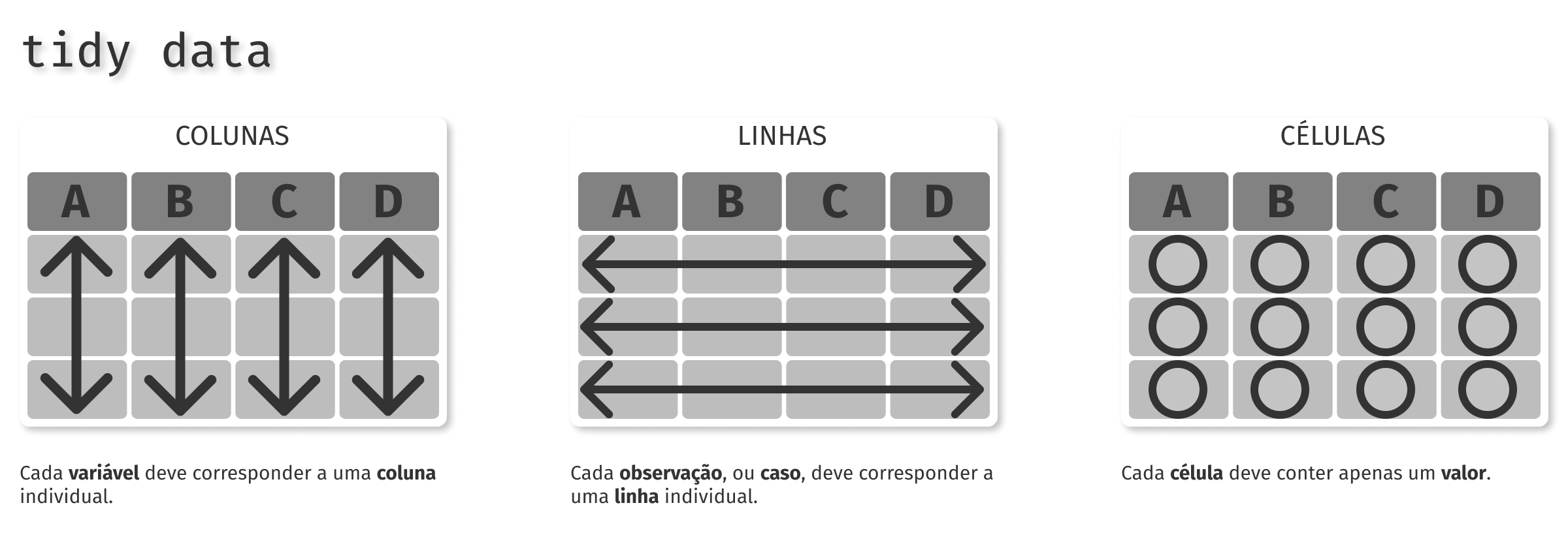 O formato tidy é um formato de dados usado em bancos de dados e é a melhor forma de organizar os dados para se fazer operações estatísticas no R e construir gráficos.